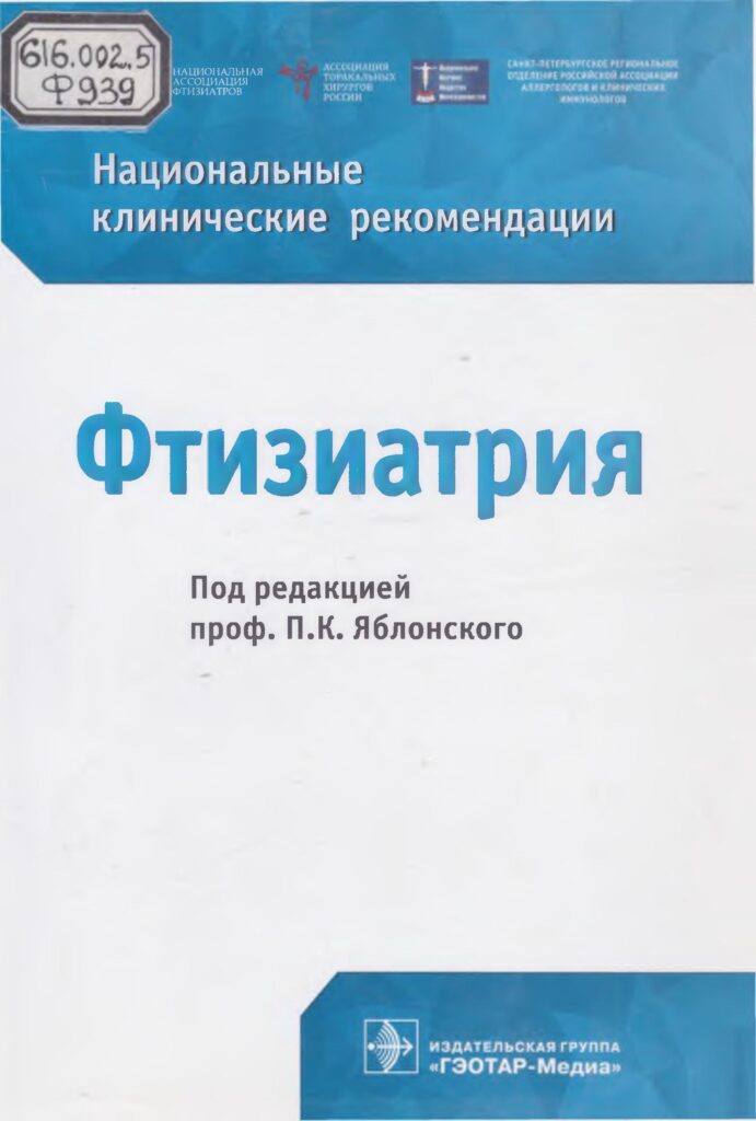 Фтизиатрия : национальные клинические рекомендации / под ред. президента Национальной ассоциации фтизиатров, директора ФГБУ “СПб НИИФ” Минздрава России д-ра мед. наук, проф. П.К. Яблонского ; Нац. ассоциация фтизиатров, Ассоциация торакальных хирургов России, СПб региональное отд. Российской ассоциации аллергологов и клинич. иммунологов. – М. : Гэотар-Медиа, 2015. – 230 с.