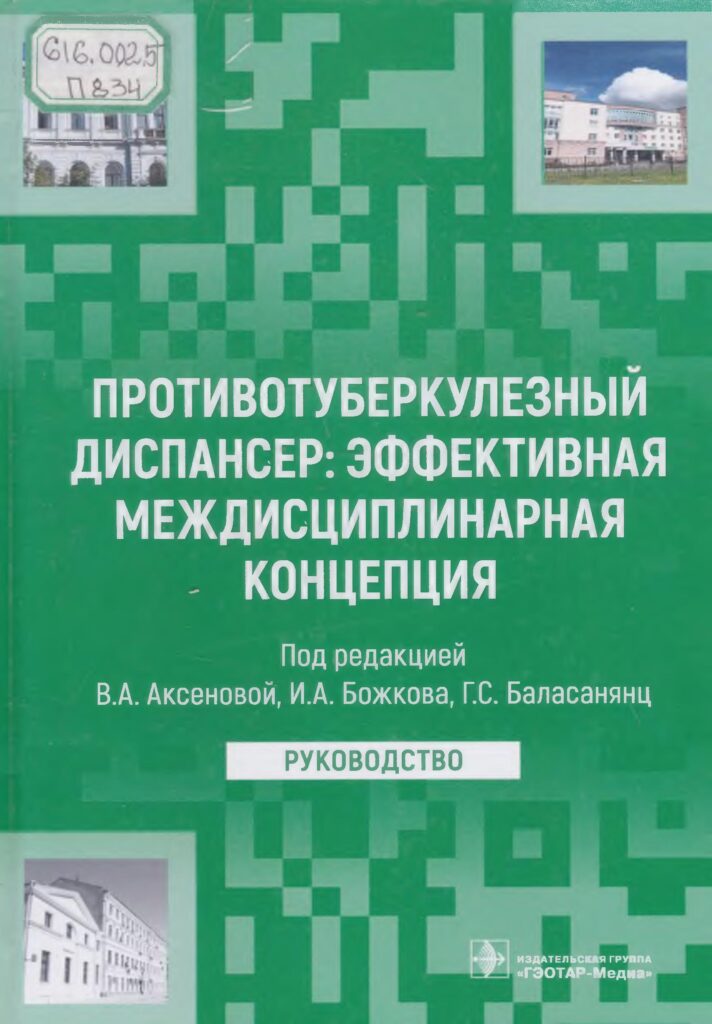 Противотуберкулезный диспансер: эффективная междисциплинарная концепция. [Текст] : руководство / под ред. В. А. Аксеновой, И. А. Божкова, Г. С. Баласанянц. – М. : Гэотар-Медиа, 2023. – 432 с. : граф., табл.