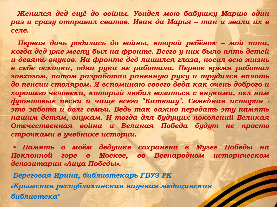 В преддверии 81-й годовщины Победы сведениями о своем родственнике, участнике Великой Отечественной Войны делится библиотекарь ГБУЗ РК “Крымская республиканская научная медицинская библиотека” – Береговая Ирина Владимировна.