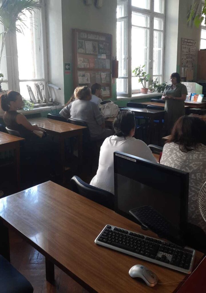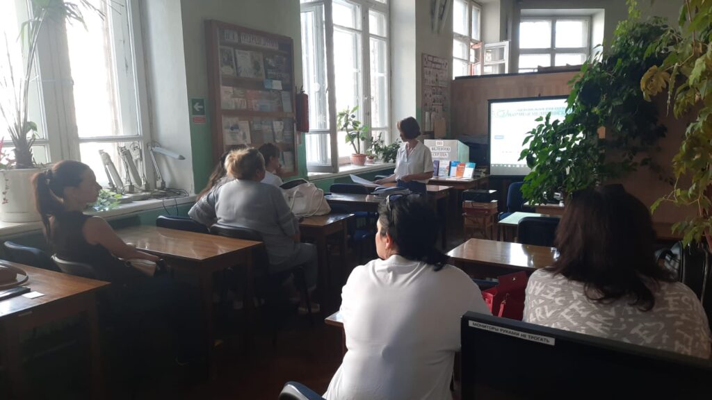 Приветствует слушателей курсов Лариса Ивановна Бойченко – заведующая отделом обслуживания ГБУЗ РК “КРНМБ” и знакомит с работой учреждения: режим работы организации, правила пользования, условия обслуживания, история создания библиотеки.