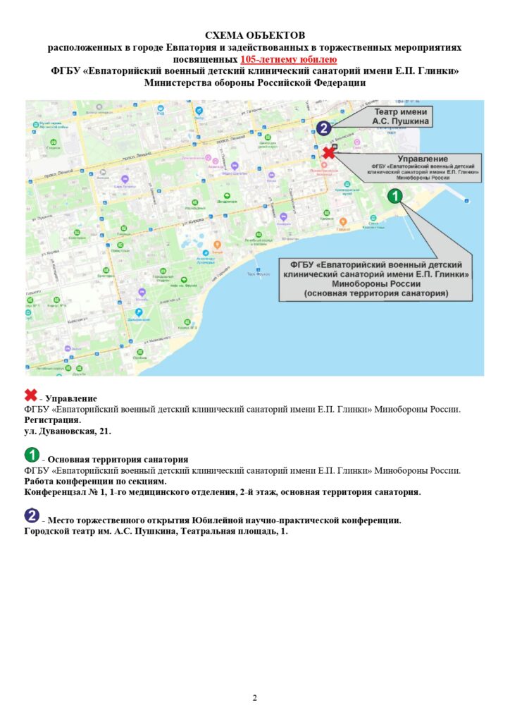 Место проведения: Управление: ФГБУ «Евпаторийский военный детский клинический санаторий имени Е.П. Глинки» Минобороны России. Регистрация – ул. Дувановская, 21.