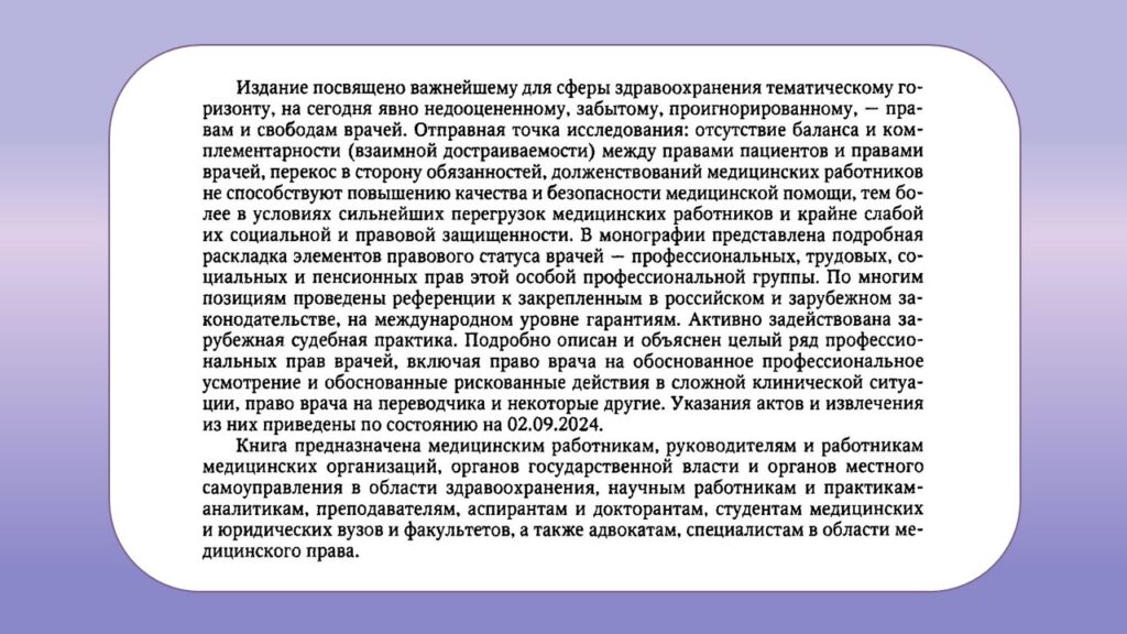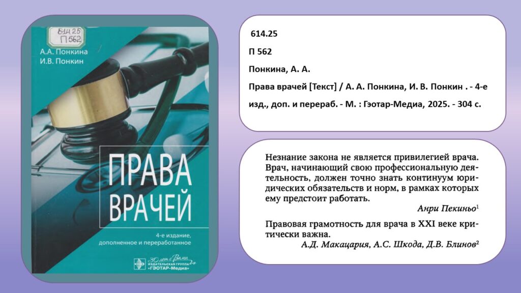 Сегодня, когда в приоритете ставится учет интересов пациента, здравоохранение зачастую расценивается как сфера услуг. Современная система характеризуется преобладанием прав больного над обязанностями медицинского работника. Возникает закономерный вопрос: обладает ли врач собственными правами?  Для поиска ответов рекомендуем  обратиться к книге Александры и Игоря Понкиных под названием «Права врачей».