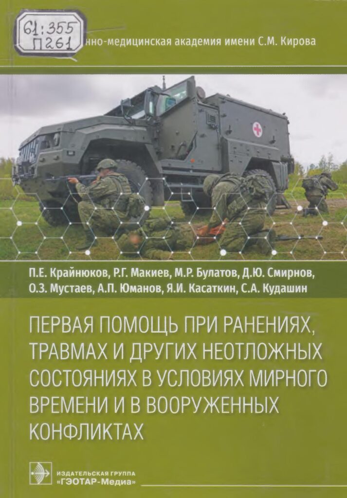 Первая помощь при ранениях, травмах и других неотложных состояниях в условиях мирного времени и в вооруженных конфликтах [Текст] : монография / Крайнюков П. Е.[ и др.] ; Военно-медицинская академия им. С. М. Кирова. – М. : ГЭОТАР-Медиа, 2023. – 181 с. : фот. цв., рис. – Библиогр.: с. 177-178.