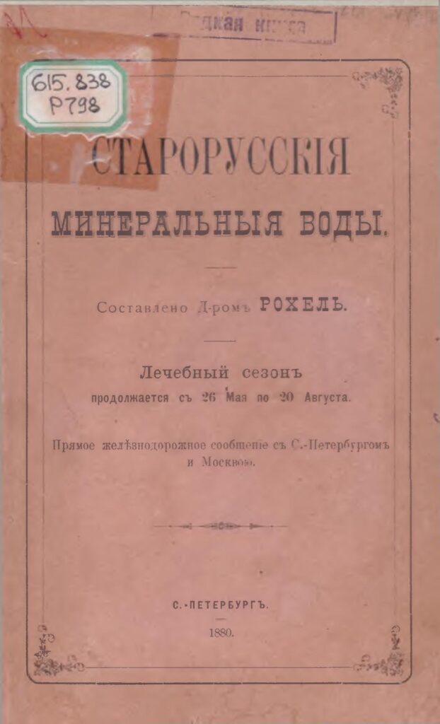 Старорусскiя минеральныя воды [Текст] : съ приложенiемъ 2-хъ плановъ и 2-хъ видовъ. Лечебный сезонъ продолжается съ 26-го мая по 20-е августа. Прямое железнодорожное сообщение съ С.-Петербургомъ и Москвою / Рохель. – С.-Петербургъ : [б. и.], 1880. – 55 с. : ил.