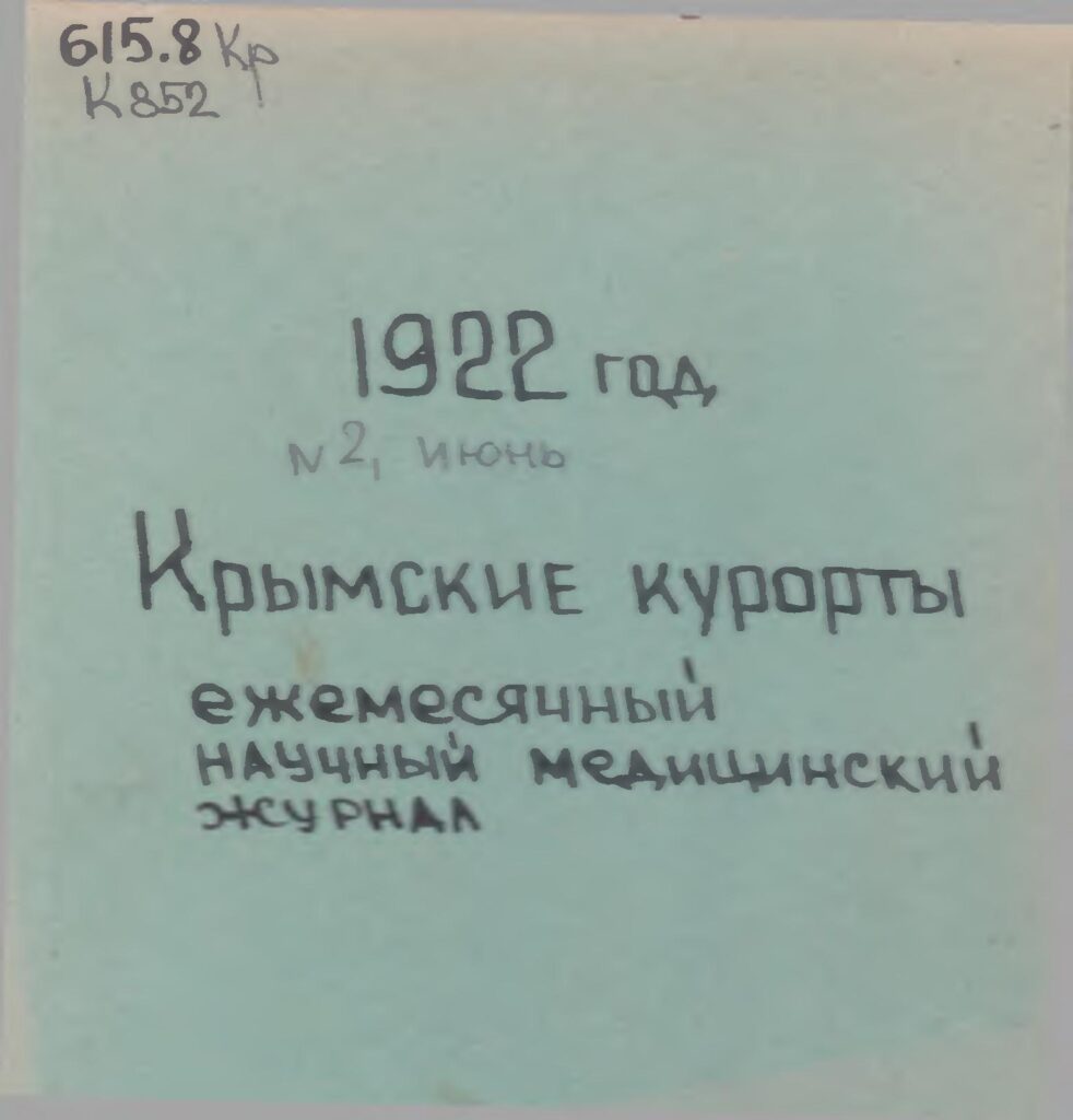 Крымские курорты [Текст] : ежемесячный научный медицинский журнал, издаваемый Центральным Управлением Курортами Крыма. № 2 / Отв. ред. Л. С. Туркельтауб. – [Б. м. : б. и.], 1922.