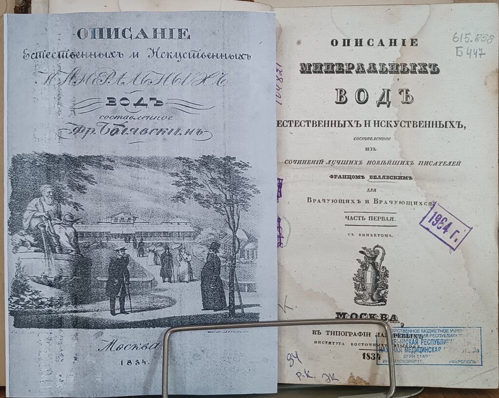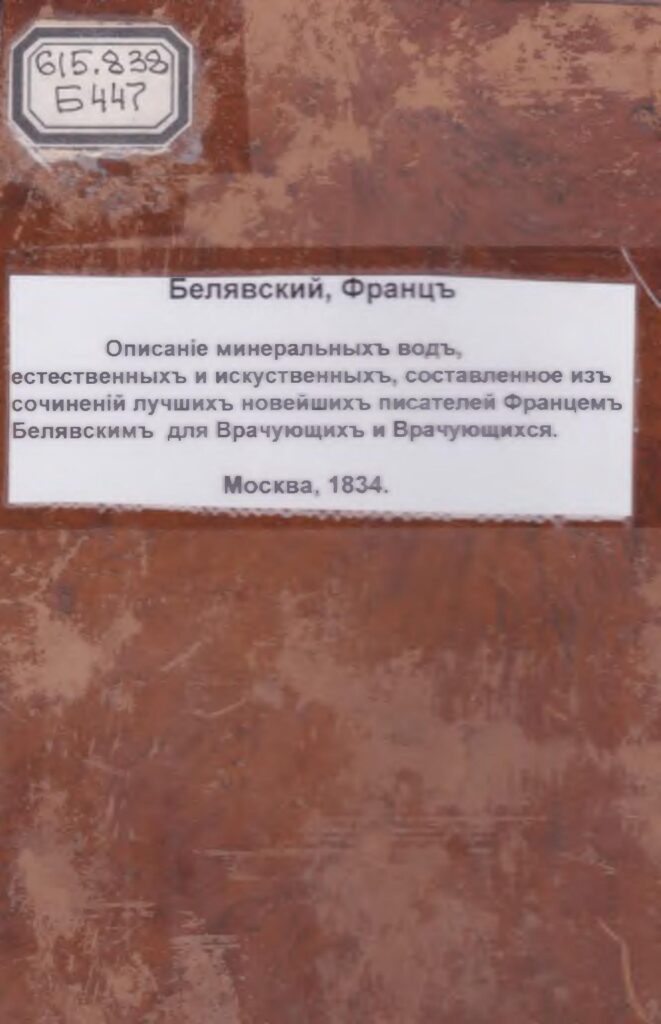Белявский, Ф. Описание минеральныхъ вод естественных и искусственныхъ [Текст]. Ч.I -я / Сост. из сочинений лучших новейших писателей для врачующих и врачующихся. – М. : Без изд-ва, 1834. – 271 с.
