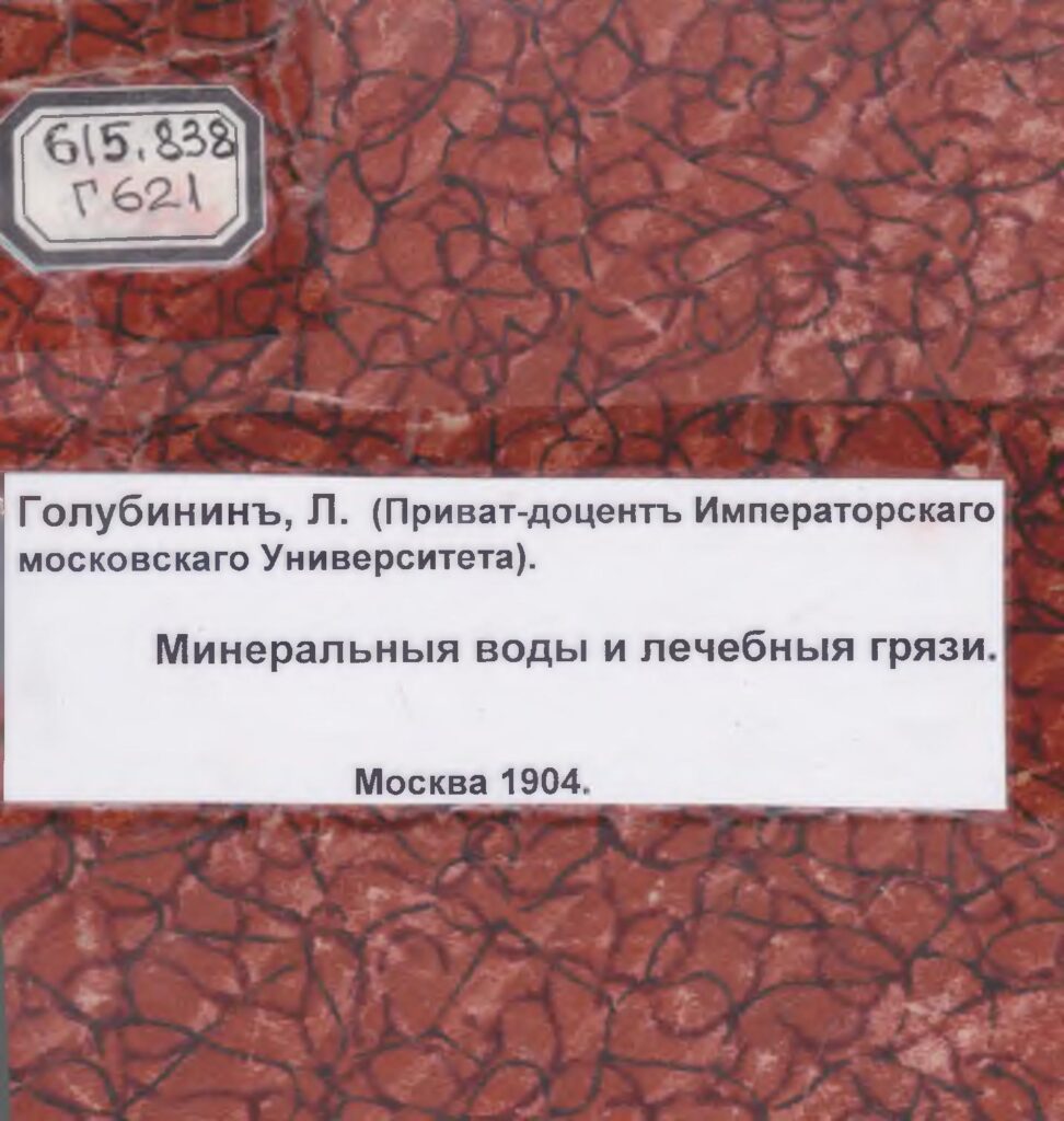 Минеральныя воды и лечебныя грязи [Текст] : монография / Л. Голубинин. – М. : Т-во скоропеч. А.А. Левенсонъ, 1904. – Библиогр.: с.314-315. – Алф. указ.: с. 309-313.