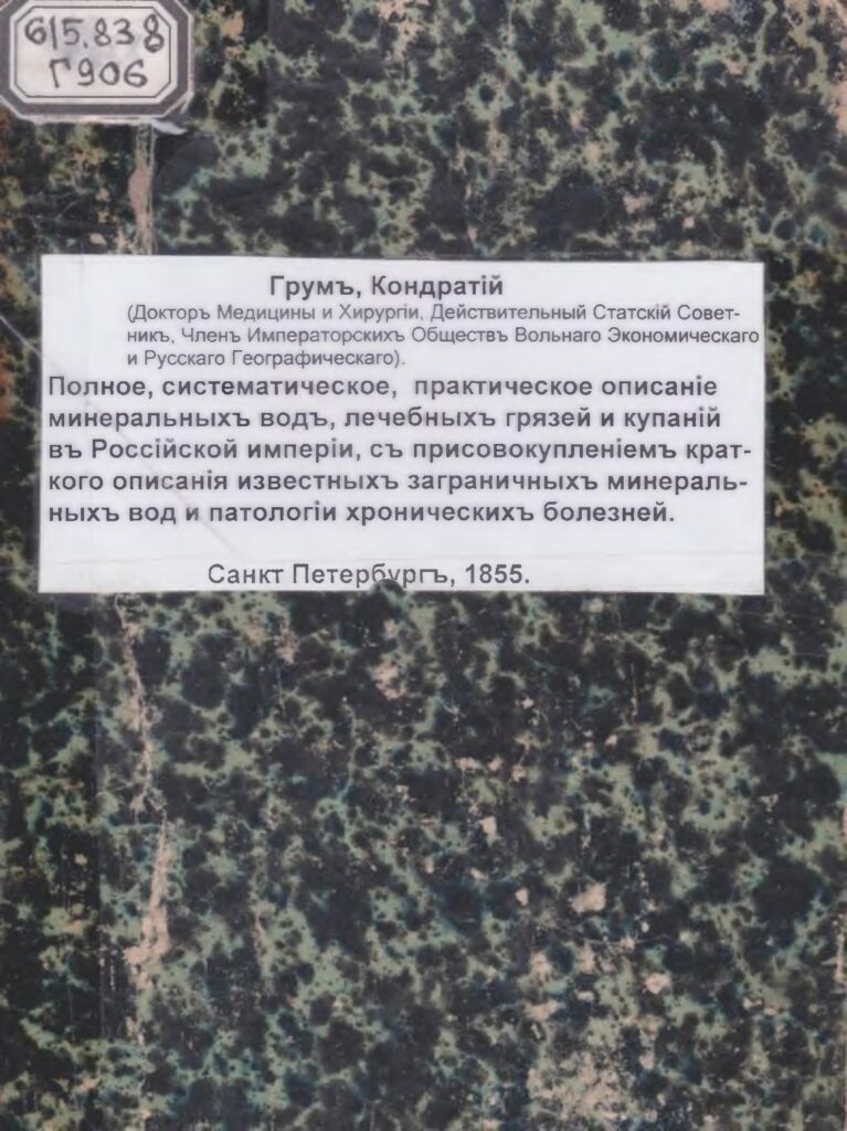 Полное, систематическое, практическое описанiе минеральныхъ водъ, лечебныхъ грязей и купанiй въ Россiйской имперiи, съ присовокупленiемъ краткого описанiя известныхъ заграничныхъ минеральныхъ вод и патологiи хроническихъ болезней [Текст] : монография / Кондратiй Грумъ. – Санкт Петербургъ : Из типографiи Департамента внешней торговли, 1855. – 286 с.