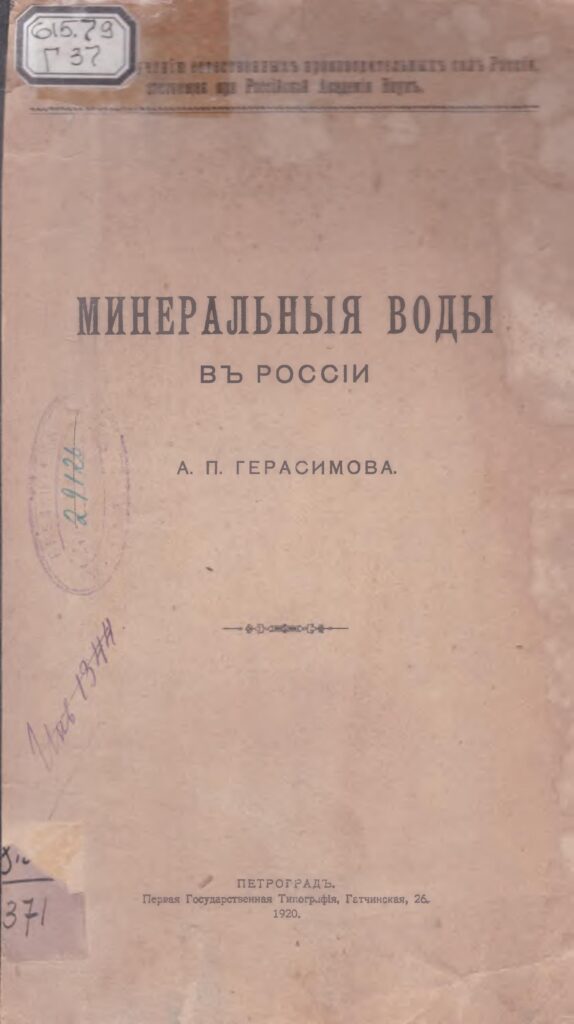Минеральныя воды въ Россiи [Текст] : монография / А. П. Герасимовъ ; [Комиссiя] по изученiю Естественныхъ производительных силъ Россiи, состоящая при Россiйской Академiи Наукъ. – Петроградъ : Первая ГОс. Типографiя, Гатчинская, 26, 1920. – 153 с.