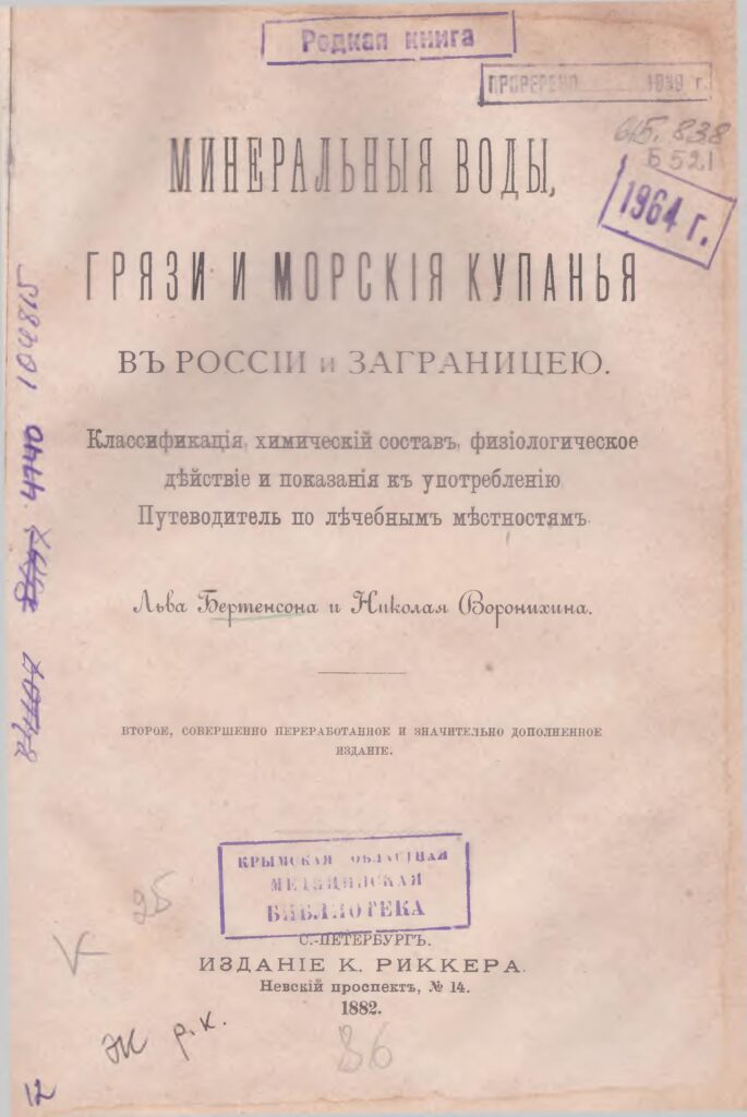 Минеральныя воды, грязи и морскія купанья въ Россіи и заграницею. [Текст] : классификація, химическій состав, физіологическое действіе и показанія къ употребленію. путеводитель по лечебнымъ местностямъ / Л. Бертенсон, Н. Воронихин. – 2-е, совершенно перераб. и значительно доп. изд. – С.-Петербург : Изд. К. Риккера, 1882. – 343 с.