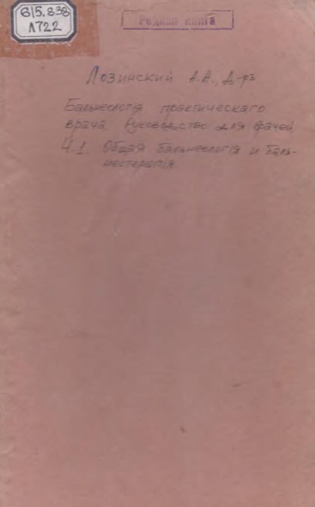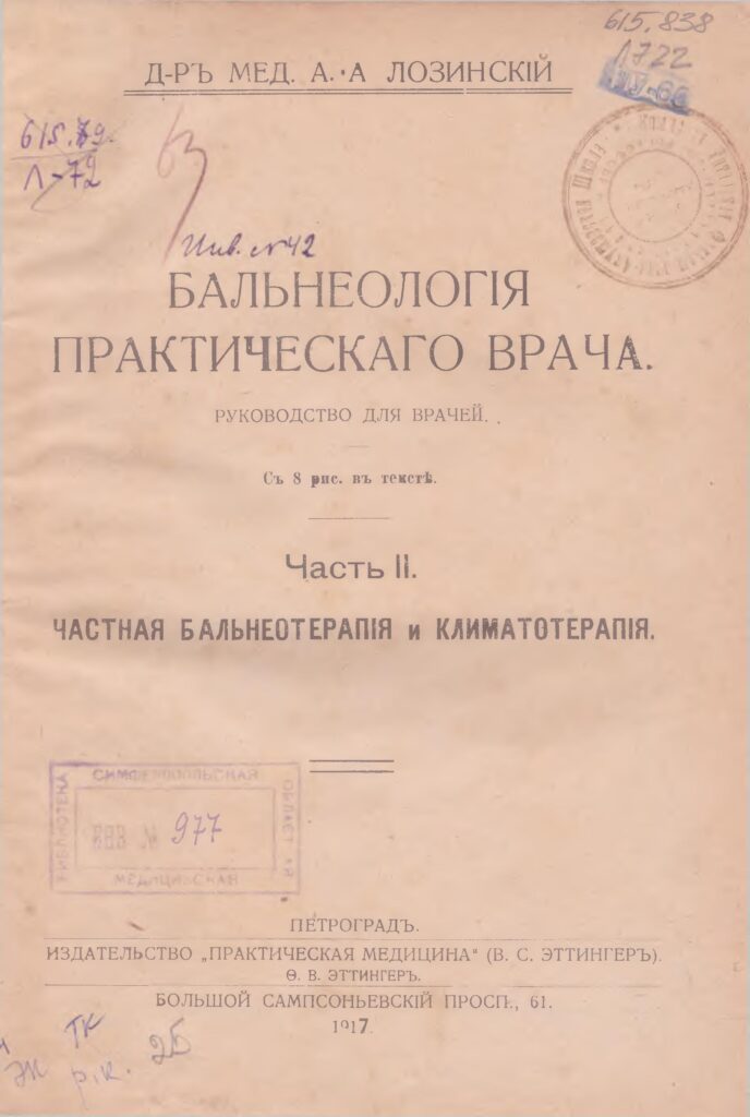 Бальнеологiя практическаго врача: Руководство для врачей. [Текст] : ч.1. Общая бальнеологiя и бальнеотерапiя, составленная при участiи В.С. Садикова (Бальнеохимiя, бальнеофизика и бальнеодинамика), М.В. Сергеева (Геологiя и гидрологiя), И.И. Иванова и Ф.П. Бялокура (Виноградное леченiе), А.Н. Рубеля (Кумысолеченiе) и М.С. Уварова (Гигiена лечебныхъ местностей) / А.А. Лозинский. – Петроградъ : Изд-во “Практическая Медицина” (В.С. Эттингеръ) Ф.В. Эттингеръ, 1916. – 654 с., 144 с., 208 с.