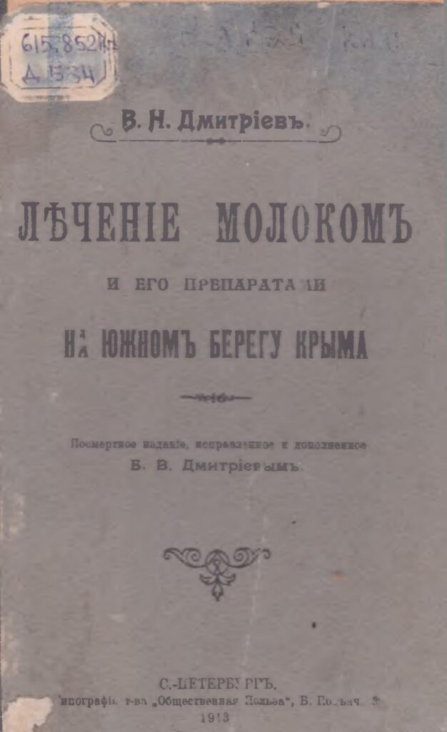 Леченiе молокомъ и его препаратами на Южномъ берегу Крыма [Текст] : посмертное издание испр. и доп. Б.В. Дмитриевым / В.Н. Дмитрiевъ. – Посмертное изд., испр. и доп. Б.В. Дмитрiевымъ. – С.-Петербургъ : Типографiя т-ва “Общественная Польза”, 1913. – 48 с.