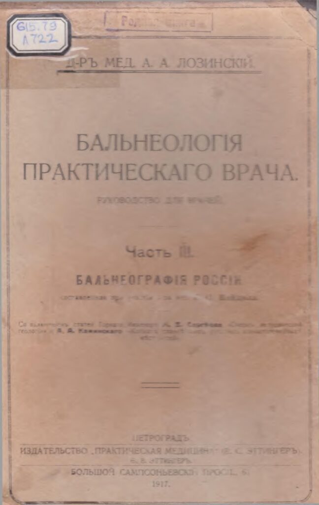Бальнеологiя практическаго врача [Текст] : руководство для врачей. Ч. III. Бальнеографiя Россiи, составленная при участiи д-ра мед. Г.С. Канцеля. С включением статей Горнаго инженера М.В. Сергеева “Очеркъ исторической геологiи” и А.А. Каминскаго 2Климатъ главнейшихъ русскихъ климатолечебныхъ местностей” / А.А. Лозинскiй. – Петроградъ : Изд-во “Практическая медицина” (В.С. Эттингеръ), 1917. – 240 с.